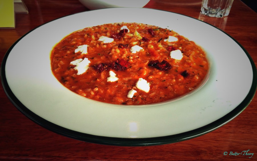 I was looking for a gluten free vegetarian dish, which eliminates pizzas, burgers, pastas, wraps and everything non-vegetarian. I was left with very little option but to pick Risotto. So, I picked Sundried Tomato, Mascarpone Cheese Risotto . This dish had a rich zesty flavor. The rice used was short grain, most likely the vialone nano. The mascarpone cheese and sundried tomatoes were great to taste 🙂 I loved the dish!!
