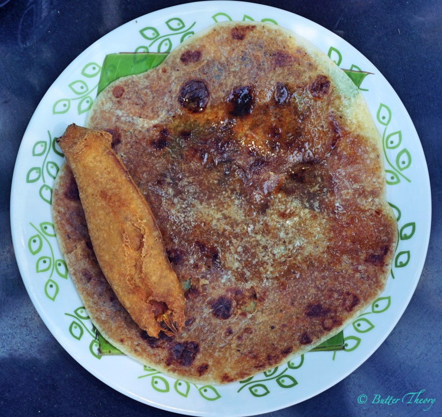 After this, the first thing that we ate was a mirchi bajji(spicy fritter with chilly) along with a obbattu(sweet flatbread). The bajji didn’t have the heat levels that would make us go crazy and have the obbattu. This would have been a perfect combination, but the bajji played a spoilsport, not wanting to join the party! But, was the obbattu good ? It was good, had oodles of ghee on it. The only thing I would have liked to see was a thicker obbattu with more coconut filling. But, the taste was perfect ๐