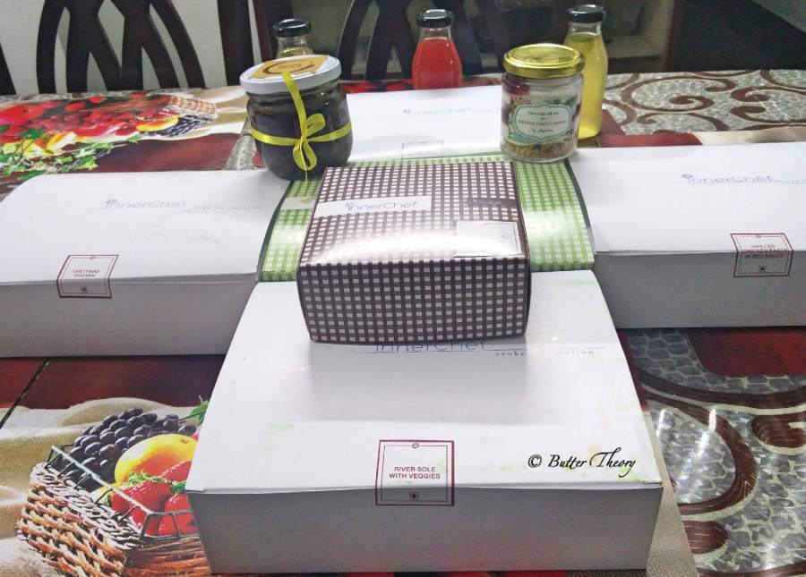As the Innerchef staff arrived at my doorstep, I could see a huge bag with lots of boxes!! I was excited about this already π Each and every box was very beautifully crafted. The color scheme was mostly white, while some boxes had a checkered pattern! The boxes were made of cardboard. I was totally impressed with the packaging. As we opened the boxes, there was a cookie in each box! That was a nice gesture π I am not going to show you a picture of the cookie π No, points for guessing why; it’s heart shaped and too cute to be pictured by a guy! Awkward π