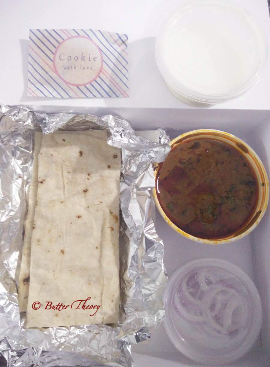 As we opened the box, we saw a plastic box of the Mutton curry. My first impression was that, the quantity of the gravy seemed inadequate. At the end of tasting session I was totally wrong about this! This dish came with Rumali rotis( a tandoori flatbread ) and a serving of curd.